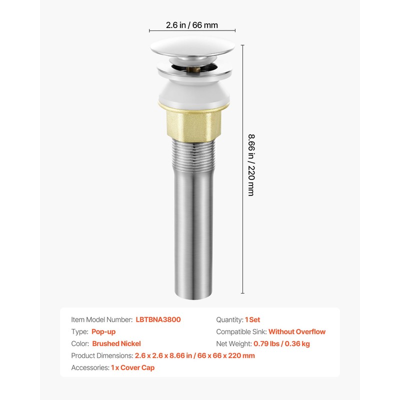 - Standard Drain Pipe: Compatible with sinks without overflow holes, this vessel sink drain fits holes of 1.5-1.9 in and sink thicknesses of 0.78-1.97 in. Drain pipe diameter is 1.25 in. Please confirm compatibility with your sink before purchase.