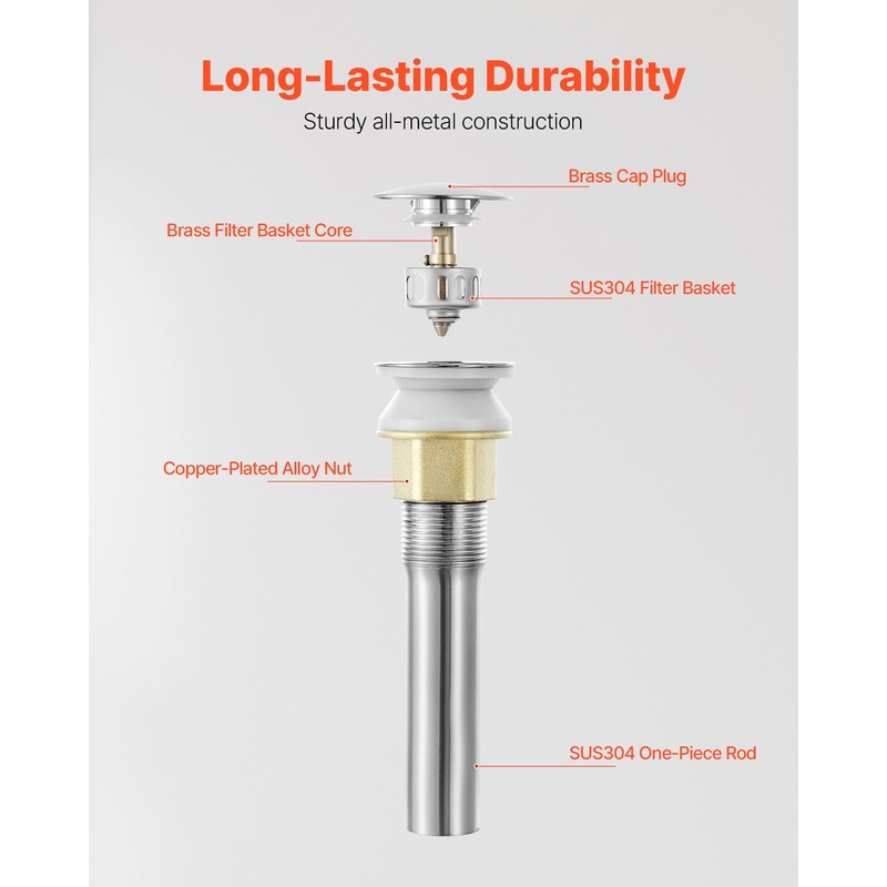 - All-Metal Material: This bathroom sink drain is made from solid brass and SUS304 stainless steel, ensuring durability. It maintains excellent performance and appearance in daily or humid conditions. Ideal for your bathroom.