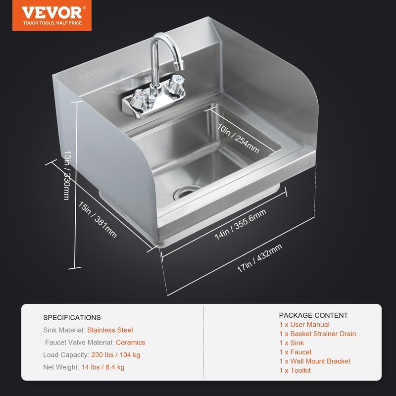 VEVOR Commercial Hand Sink with Faucet and Side Splash, NSF Stainless Steel Sink for Washing, Small Hand Washing Sink, Wall Mount Hand Basin for Restaurant, Kitchen, Bar, Garage and Home, 17x15 inch