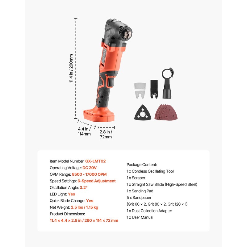 - Multi-functional Tool Kit: VEVOR 20V cordless oscillating tool kit includes a stainless steel scraper, high-speed steel straight saw blade, sanding pad, and 5 sandpapers (60/80 Grit *2, 120 Grit * 1)). Ideal for home improvement, woodworking, and DIY projects