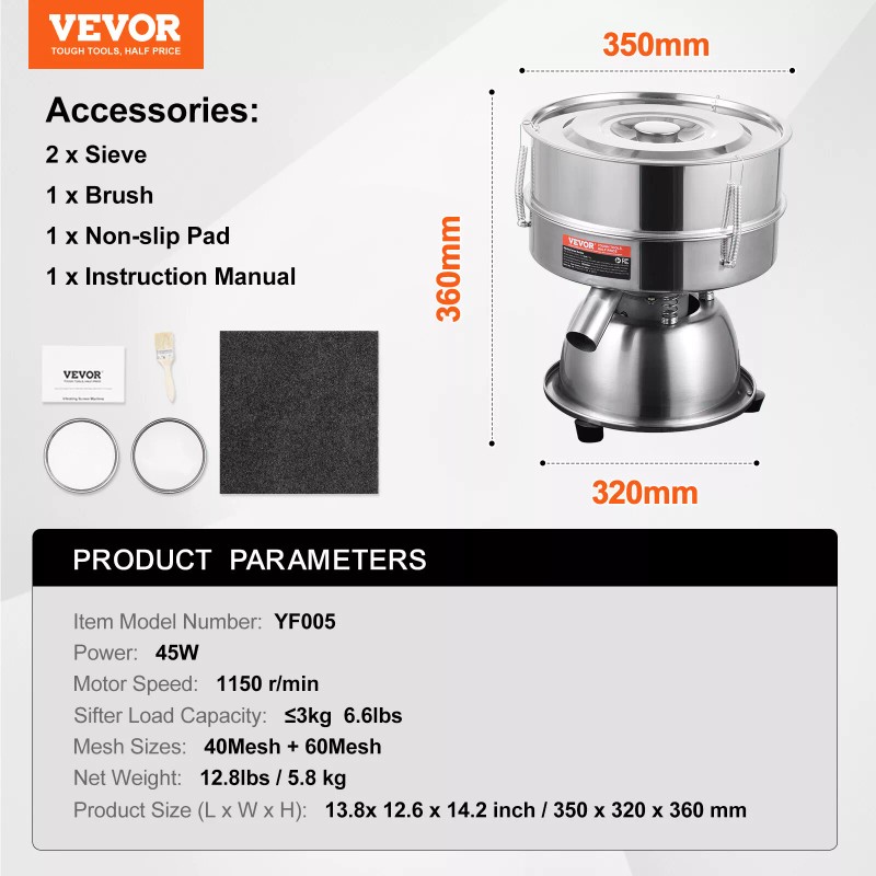 VEVOR Electric Vibrating Sieve Machine with 40+60 Mesh Automatic Sifter Shaker