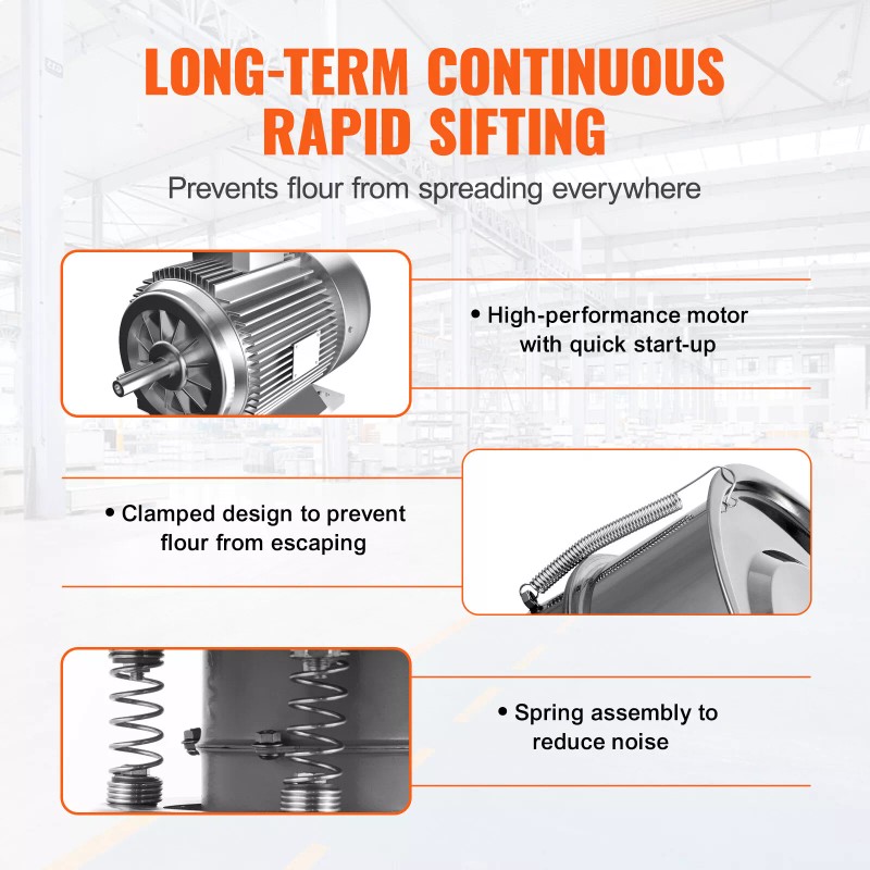 - Countertop Design: Our vibrating sieve can be installed at any desired location without fixing, making it easy to move. The rubber foot caps and strong non-slip pads reduce noise, prevent slipping, and protect surfaces, ensuring stable and efficient operation. This design is widely used in restaurants, bakeries, flour mills, home kitchens, and more.)