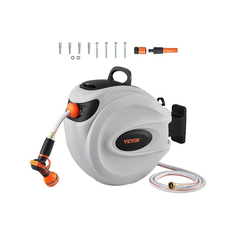VEVOR Retractable Hose Reel, 130 ft x 1/2 inch, Garden Water Hose Reel with 9-Pattern Nozzle, 180° Swivel Bracket Wall-Mounted, Automatic Rewind, Lock at Any Length, with Slow Return System