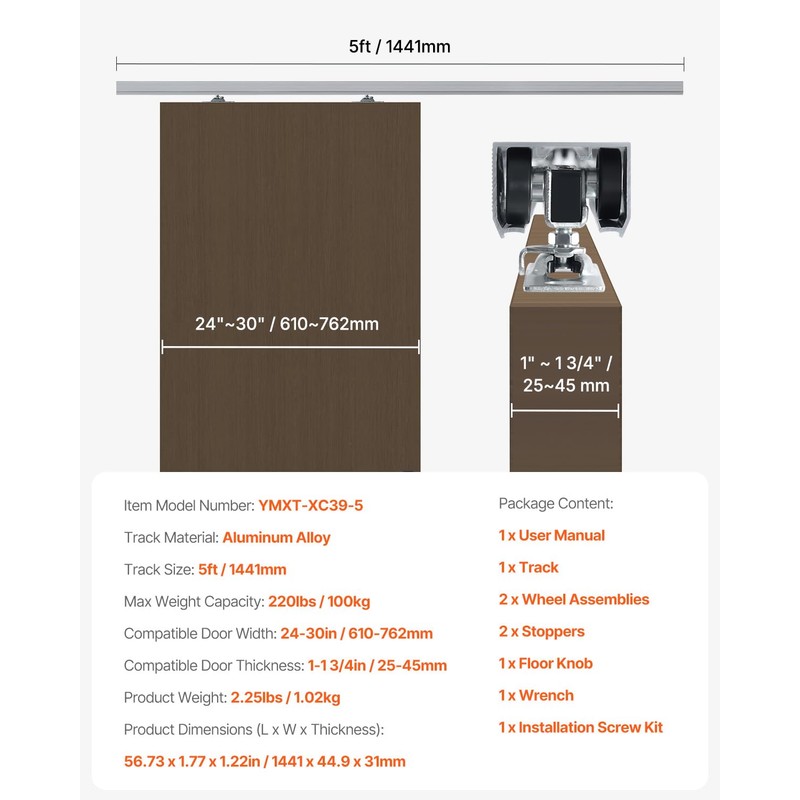 - Applicable Door: This 5ft sliding door hardware and track kit fits door thicknesses from 1" to 1 3/4" and door widths from 24" to 30", with a maximum weight capacity of 220 lbs. You can choose the size that suits your needs.