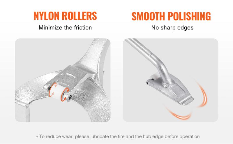 Tire-Friendly Design: The tire changer is equipped with thickened and smooth parts that come into contact with the tire and wheel hub. The dismounting tool features a nylon roller that smoothly inserts into the wheel hub, preventing damage or rubbing and ensuring your new tires remain intact. For enhanced tire protection, we recommend applying proper lubrication during operation to minimize friction.