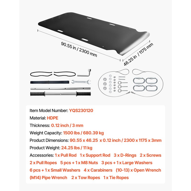 VEVOR Yard Drag Sled, 90 x 46 in, 1500lbs Heavy Duty Utility Sled, HDPE Drag Glider with Ropes & Pull Cables, Hand & Vehicle Use Game Hauler for Firewood Ice Fishing,Compatible with ATVs UTVs Tractors