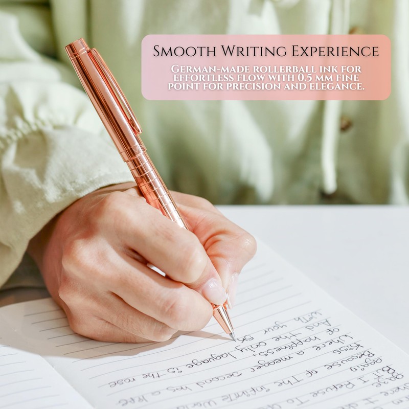 - Luxurious Rose Gold Pen: Includes a sleek, refillable 0.5 mm fine point rollerball pen with smooth-flowing German black ink, elevating your writing experience.