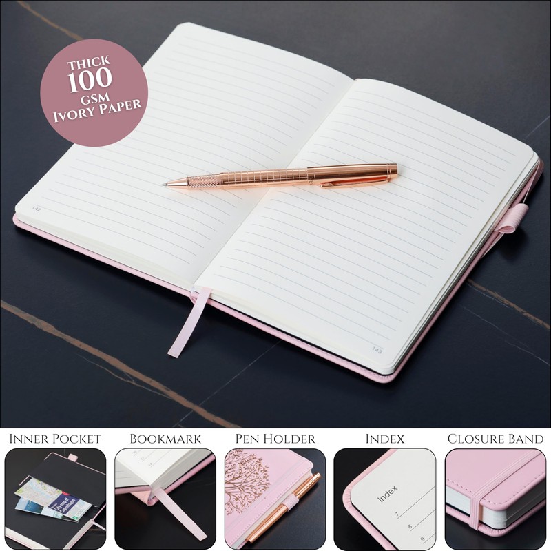 - Exquisite Embossed Designs: Choose from the graceful rose gold Enchanted Butterfly or the timeless Eternal Tree of Life, both on elegant pastel pink vegan leather covers.