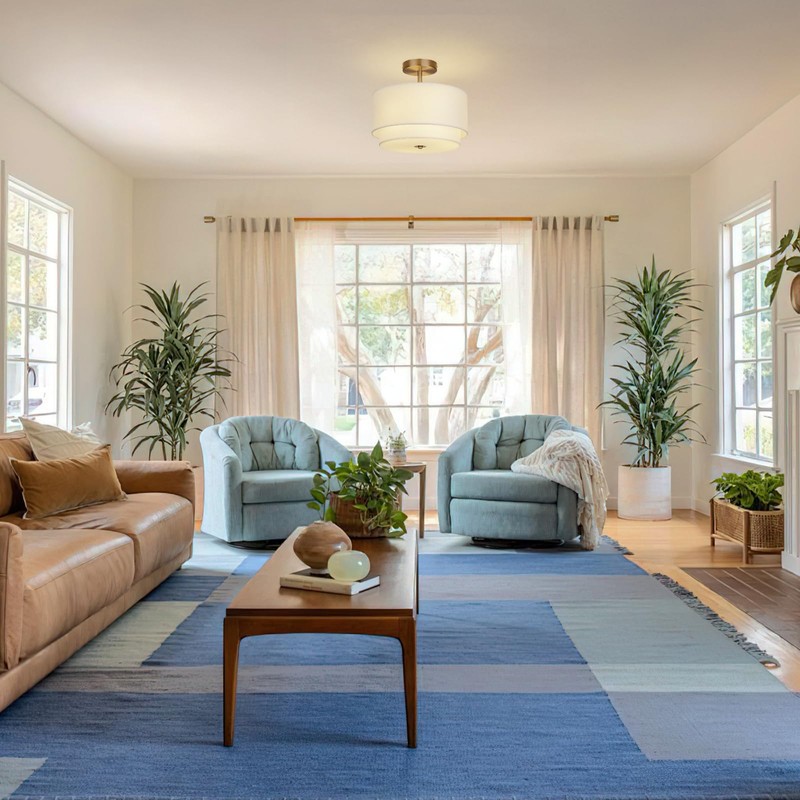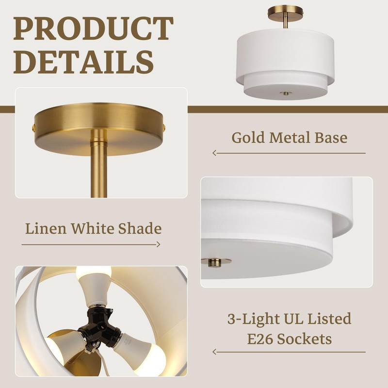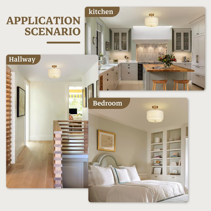 - Elegant Design:The gold semi flush mount ceiling light blend classic elegance with modern decor, featuring a distinctive two-layer shade that adds a touch of modern and farmhouse charm while enhancing lighting effects.They are an ideal choice for enhancing your home's overhead lighting decor.