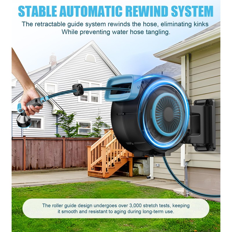 - Effortless Automatic Rewind: With the automatic rewind system, your retractable garden hose reel retracts smoothly and quickly after every use. No more coiling, knotting, or manual rewinding – just a quick pull, and the hose neatly retracts into place. This feature not only saves time but also ensures your hose stays tidy and ready for your next use.
