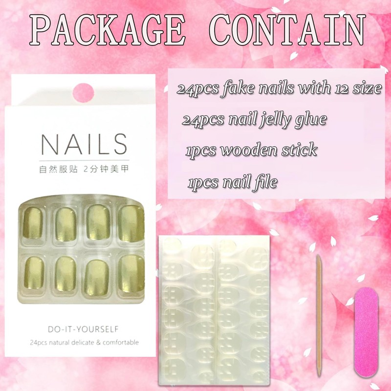 - 【False Nails Sets】You'll get 24 short coffin false nails in 12 sizes. 1 mini nail file, 1 small wooden stick, 1 piece of press on nails adhesive sticky tabs.