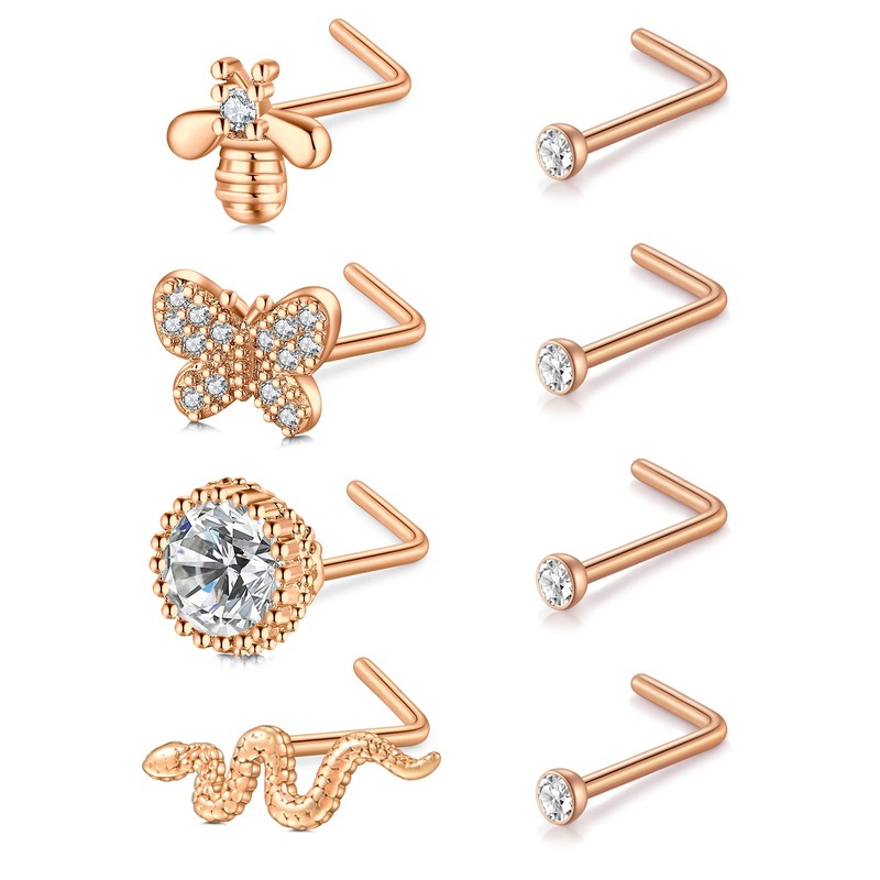 - Package includes: 8 pieces L shape rose gold nose piercing with snake, butterfly, bee, crown type, comes with a black velvet gift bag.