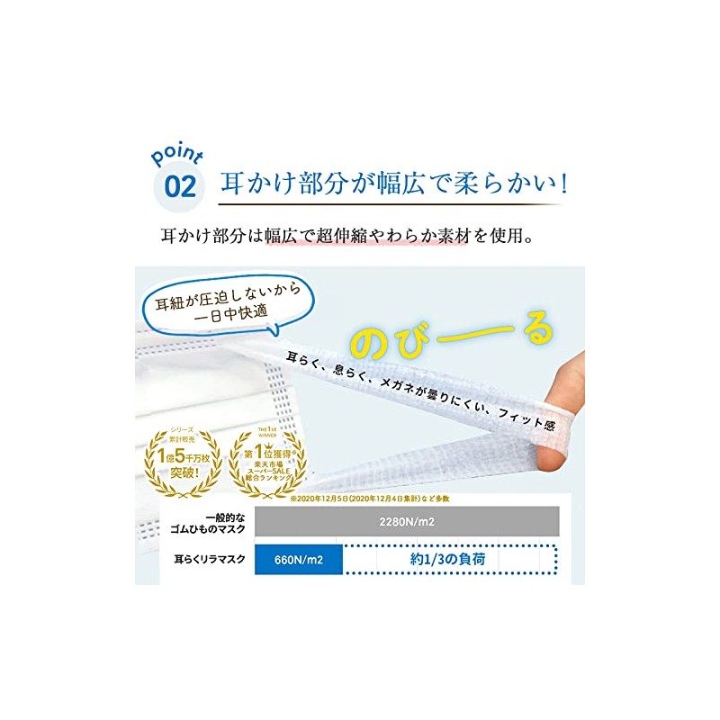 • 耳かけ部分は幅広で伸縮性に優れ、耳が痛くなりにくい。