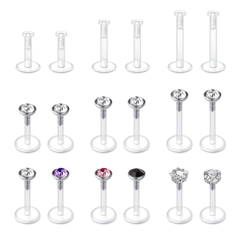 - Size: These Clear Flat Back Studs With Push Tops For Work And Sports Are 16G (1.2mm) With Bar Lengths Of 1/4" (6mm), 5/16" (8mm), 3/8" (10mm). These Plastic Piercing Retainers Are Suitable For Various Piercings Such As Dimple, Medusa, Forward Helix, Tragus, Conch, And Auricle Piercings.