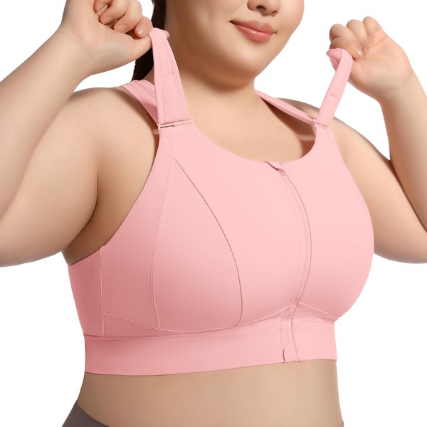VFUS High Impact Sports Bras for Women Adjustable Zip Front Plus Size Workout Bra Full Coverage Removable Padded Running (Large Plus, Pink)
