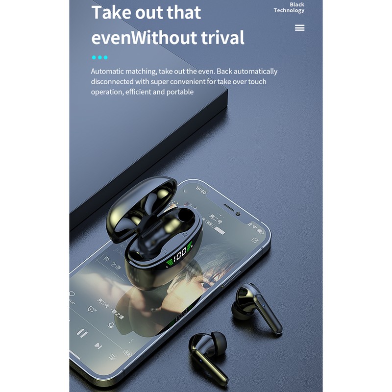 Portable wireless BT earphones, take out from the charging compartment, automatically turn on and pair.