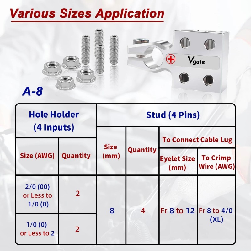 - Vgate 8-Way Connectors: 4 x hole-holders and 4 x threaded studs; It contains two 2/0 AWG and two 1/0 AWG hole holders