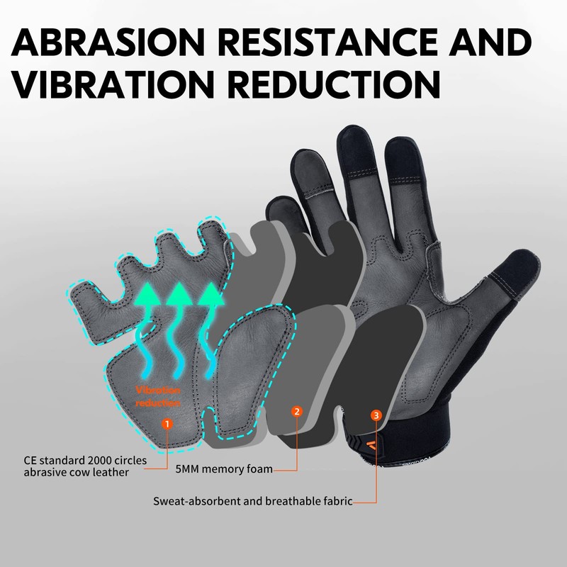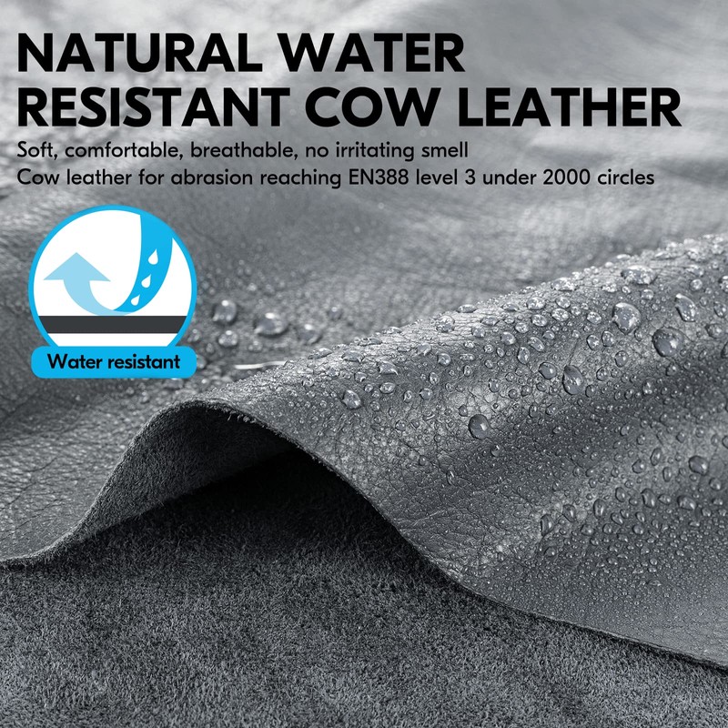 - Abrasion resistance, vibration reduction – soft, water-repellent, comfortable, breathable, odourless cowhide leather that reaches EN388 level 3 under 2000 circles, and tear resistance that reaches below 50N level 3. 2.5 mm neoprene under the padding for anti-vibration. Reinforced fingertips provide extra durability