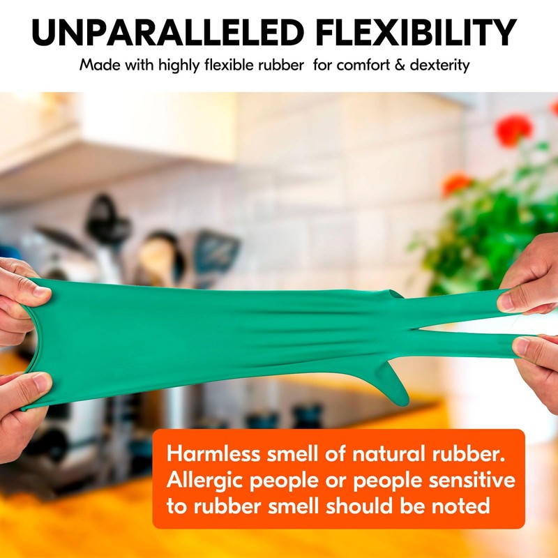 - MATERIAL - Made with highly flexible waterproof rubber for great comfort & dexterity. Anti-slip embossed palm for an excellent grip. They smelled a bit rubbery and chemical-like when you first took them out of the packaging, but after airing them out they will be fine. Allergic people or people sensitive to rubber smell should use in caution. No flocked Lining