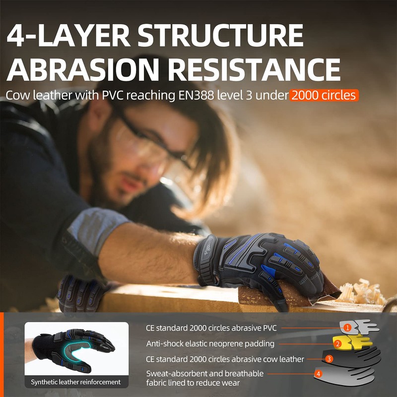 - PALM ANTIABRASION - Genuine goatskin leather with PVC reinforcement for abrasion reaching EN388 level 2 under 600 circles, boasts all-day comfort with excellent smoothness and gentleness. Elastic neoprene padding for vibration reduction