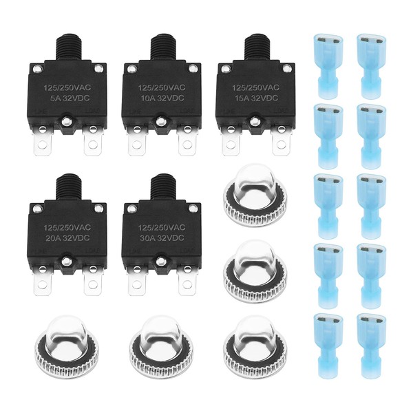 - Comprehensive Package: Each package includes 10 thermal circuit breakers, with 2 of each size: 5Amp, 10Amp, 15Amp, 20Amp, and 30Amp. Additionally, you'll find 20 quick-connect terminals and 10 waterproof button caps to cover all your needs.