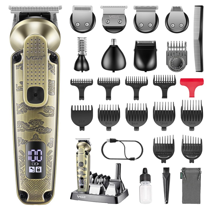 - VGR 7 IN 1 Versatile Grooming Kit: Equipped one T blade trimmer with 4 guide combs (1 mm, 3 mm, 5 mm, 7 mm), one hair trimmer with 7 guide combs (3 mm, 6 mm, 9 mm, 12 mm, 15 mm, left/right comb),one precision trimmer(1 to 10mm dial comb),one detailed trimmer,one micro razor, one nose/ear trimmer, one body groomer, one body hair trimmer head. Designed for men of all ages looking for practical grooming solutions, this trimmer is appropriate for beginners as well as expert barbers and stylists