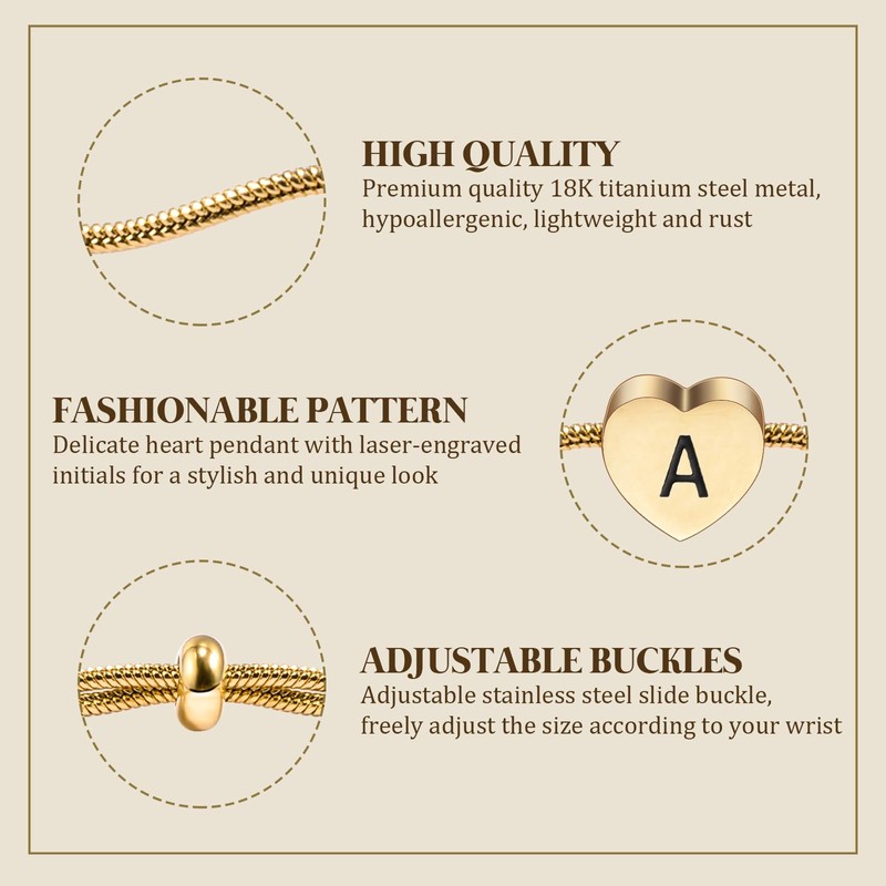 - CHARM BRACELET: This women's bracelets features an initial heart design on a snake chain, showing an expression of individuality and love