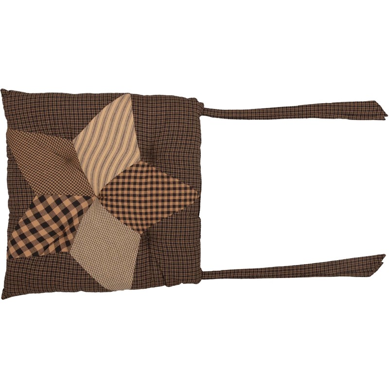 A country-style star patchwork design gets an extra dose of vintage farmhouse charm with traditional patterns of checked plaid and ticking stripes in neutral tones of black, tan and creme. The Farmhouse Star Chair Pad is a durable 14 by 14 inch square chair cushion with long ties to easily add a pop of primitive country charm to a wide variety of seating. This 3-inch thick farmhouse seat pad features a durable cotton shell and extra-thick poly-cotton batting for durable, long-lasting style while offering your chairs protection from damage. Spot clean as needed. To give your kitchen or tabletop a complete country chic look, pair with other items from the Farmhouse Star including rustic farmhouse placemats, table runners and more.