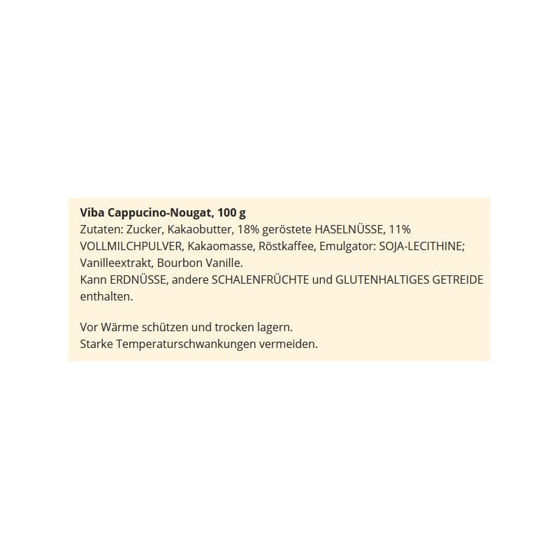 • For lovers of the finest coffee specialities, this cappuccino nougat is a top treat. The bag contains 10 individually packaged Viba Cappuccino Nougat Minis 10 g for optimal freshness.