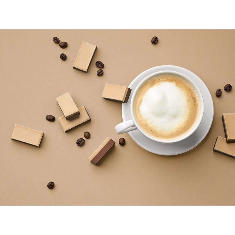 • Two fine layers of light and dark nougat chocolate combination enchant, not only visually, with a charismatic cappuccino note, which the nougat gets through finely ground roasted coffee.