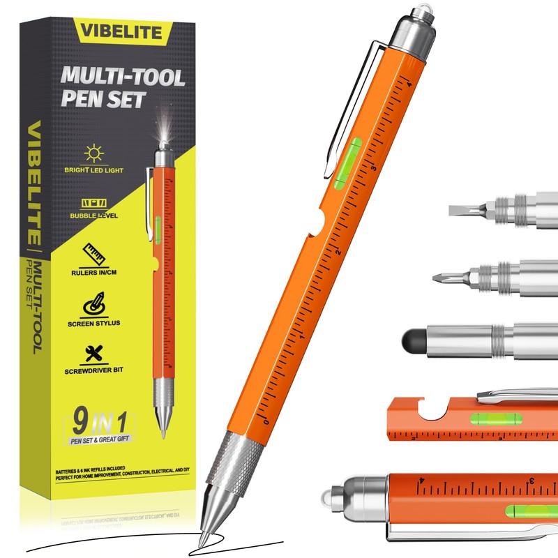 VIBELITE 9 in 1 Multitool Pen Set, Tools Gadgets for Men Gifts for Dad, Birthday Day Gifts for Men, Him, Husband, Father, Grandpa, Orange,1 Pack