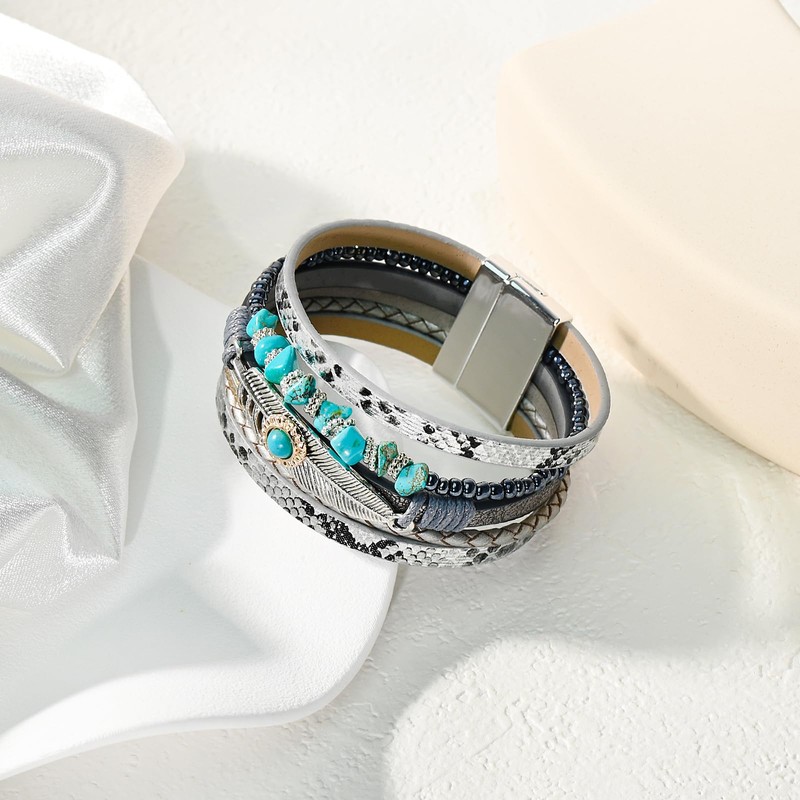 VIBILIA Boho Leather Wrap Bracelets for Women Gravel Feather Multi-Layer Bracelets with Strong Clasp Jewelry for Women-Silver & Blue