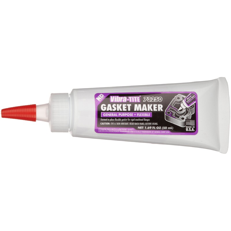 Vibra-TITE 732 Gasket Maker is a smooth, thick purple paste. The anaerobic chemistry of this product creates a tough flexible formed-in-place gasket. Once confined between 2 components, 732 Gasket Maker provides an instant low pressure seal. Gasket Maker is used for fuel and water pumps, split crank cases on engines, gearbox covers, engine thermostats, air compressor end caps, chainsaws, lawn mowers etc. This product can be used with or without pre-cut, pre-formed gaskets. Ensure parts are clean, dry and free from oil and grease before use. Product is normally hand applied from the tube. Fixture Speed with Activator is <15 minutes. Fixture Speed without Activator is 1 hour. Shelf Life is 12 months at 68 degree F. 24 hours at 68 degree F Full Cure Time. 500-2000 psi shear strength. Product should be stored in a cool and dry location at temperatures between -10 degree C to 30 degree C. Optimal storage is 22 +/- 4 degree C. Shelf life is 18 months from date of manufacture when stored at 22 +/- 4 degree C. General purpose flexible gasket maker for rigid machined flanges. Unprimed 0.010 inches; Primed 0.020 inches Maximum gap fill. 1.1 Specific gravity. Unprimed 4-24 hours; Primed 30 minutes - 4 hours Cure Speed. N Suggested primer. 50 ml Tube.