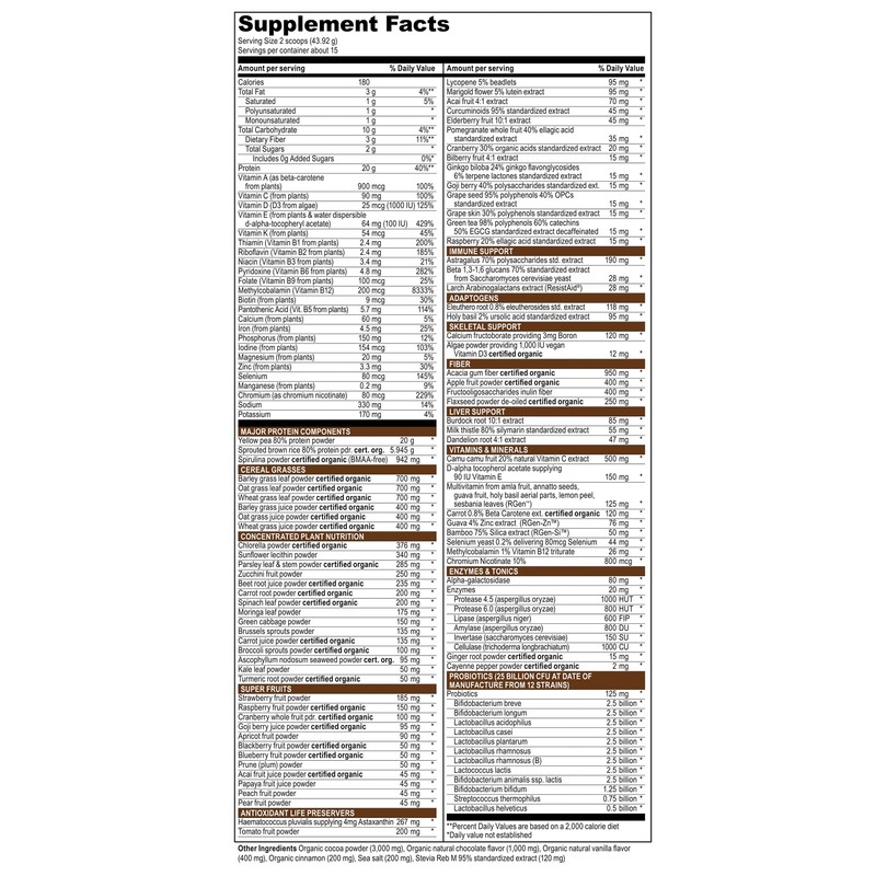 - Made with superfood ingredients to deliver 20 grams of plant protein, antioxidant-rich servings of fruits and vegetables and 25 billion CFU from 12 probiotic strains.