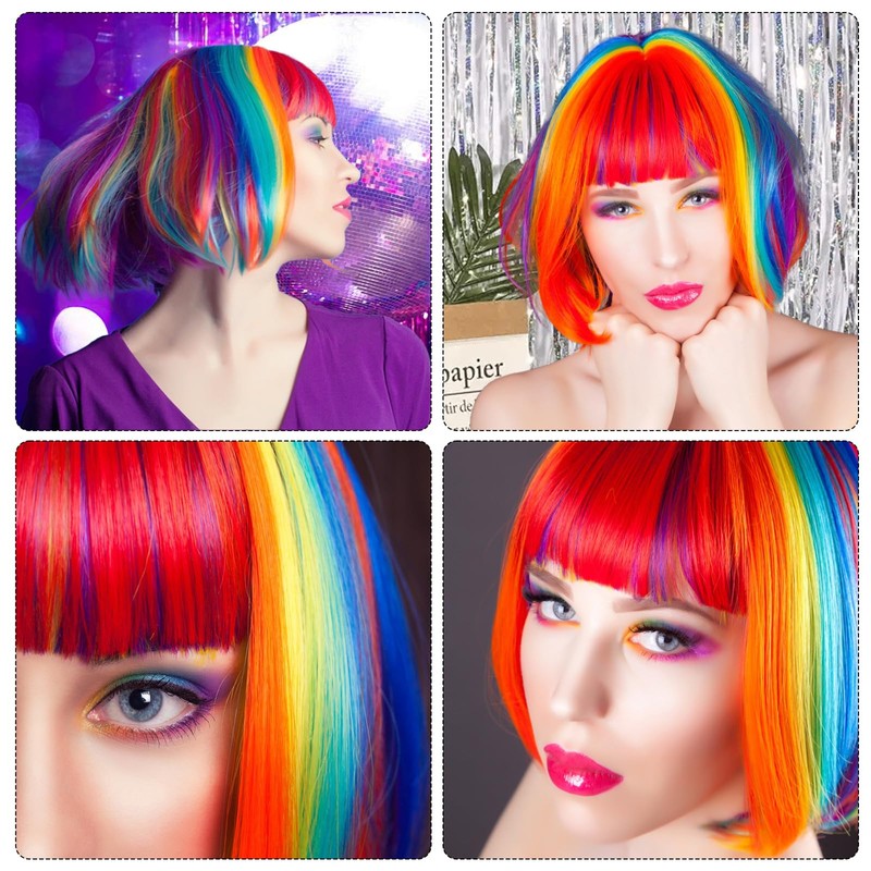 - Stylish and Versatile: This rainbow wig is designed to add a splash of vibrant colour to any outfit, making it perfect for women looking to stand out. Whether you're heading to a party or simply want to jazz up your everyday look, this bob wig is the ideal choice.