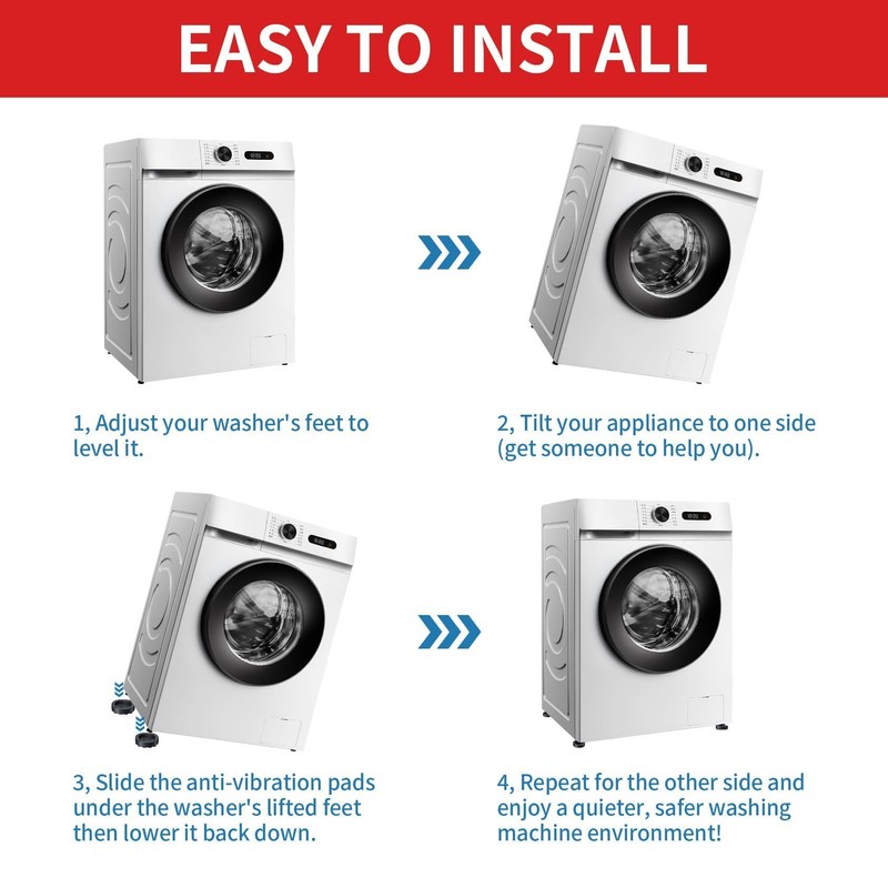 - Tool-less installation: the washing machine pad is small and practical, does not take up space and can be installed in a few steps. Simply lift every corner of the machine, slide our washing machine mat under any washing machine feet and then gently lower the device foot.