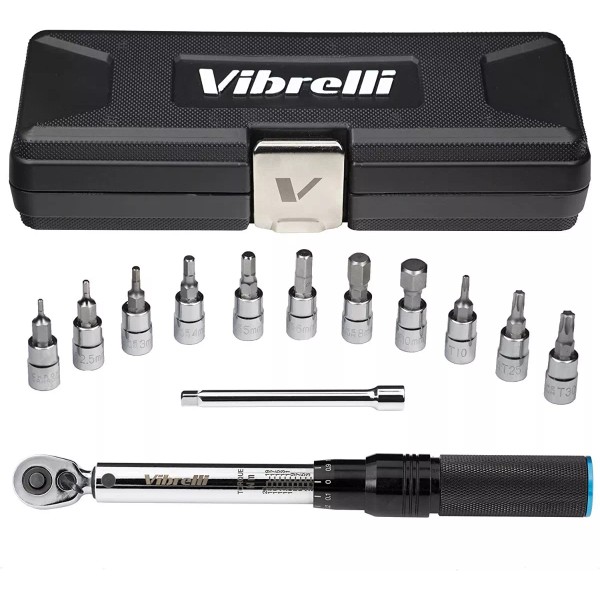 La llave dinamométrica Vibrelli es una llave dinamométrica de accionamiento por clic de 1/4 de pulgada que le permite establecer el par de apriete deseado para cada componente, evitando el ajuste excesivo y el desgaste de los pernos.