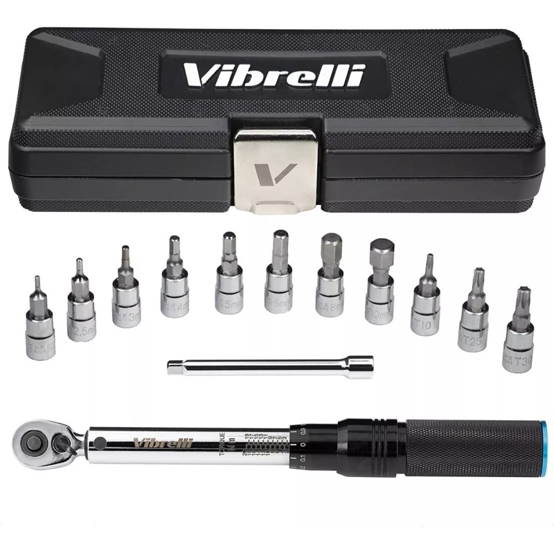 Juego de llaves dinamométricas para bicicleta Vibrelli - Unidad de 1/4 pulgadas - 2 a 20 nm, 0,1 Nm Micro - Herramientas esenciales para llaves dinamométricas para bicicletas y MTB. Hex/Allen 2-10, Torx 10-30, dado de extensión de 100 mm, estuche de almacenamiento