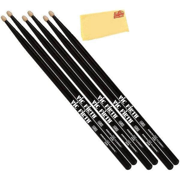 Vic Firth 5A American Classic Drum Sticks - Black, 3 Pairs Bundle with Austin Bazaar Polishing Cloth