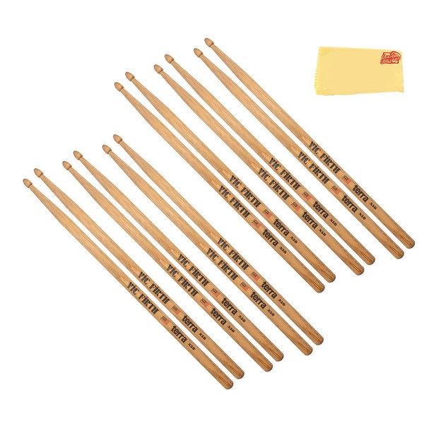 Vic Firth American Classic X5BT Terra Series Wood Tip Drumsticks - 6-Pack Bundle with Austin Bazaar Polishing Cloth