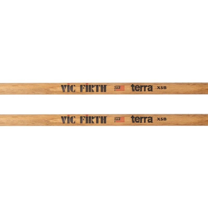 The Vic Firth American Classic X5BT Terra Series Drumsticks are built for drummers who value both strong performance and natural aesthetics. As part of the Terra Series, they feature a special staining process that reveals the unique wood grain in each pair, ensuring no two sets are alike. Crafted from premium USA hickory at Vic Firth’s facility in Newport, Maine, these sticks are made to be durable and comfortable to play. Slightly thicker than the X5AT model, the X5BT provides added strength and a more solid feel, making it ideal for rock, metal, and heavier pop music. The medium taper offers a balanced response, while the classic tear drop wood tip produces rich cymbal tones and clear articulation. Whether on stage, in the studio, or at practice, the X5BT Terra Series delivers a reliable mix of power, control, and distinctive style.