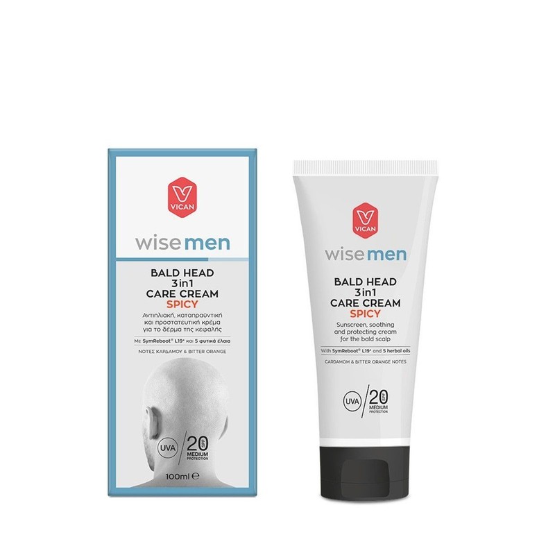Wise men bald head 3 in 1 care cream protects and cares the exposed scalp from external factors while its suncare Spf 20 action with UVA/UVB filters offers protection from everyday sunlight. Its active composition with natural ingredients and oils soothes dryness, itching and the feeling of streching, as well as minor irritations caused by shaving. The pioneering ingredient SymReboot L19 respects the skins microbione,while it maintains moisturization and skin's barrier function.