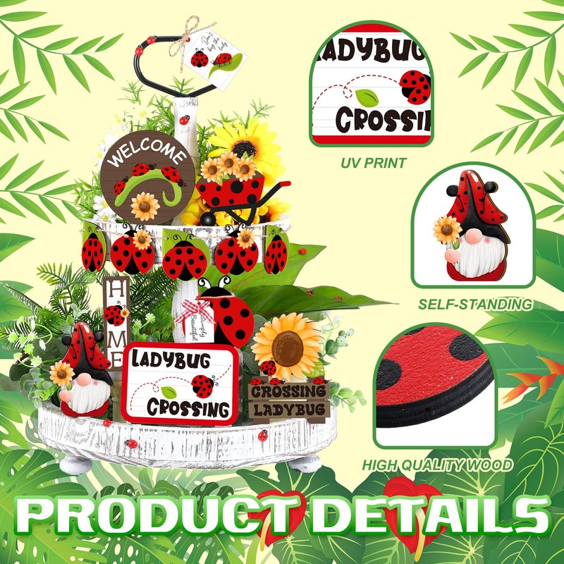 - Cute and Aesthetic Ladybug Tray Decors: experience a fresh wind of classic color visuals in your home decoration with this set of 13 ladybug themed spring tiered tray decorations set and 1 rope, including cute ladybug patterns, stroller carts, sunflowers, gnome, etc; These pieces, made with reliable wood material, bring an adorable and aesthetic appeal to your home, catering to your decor needs with precision