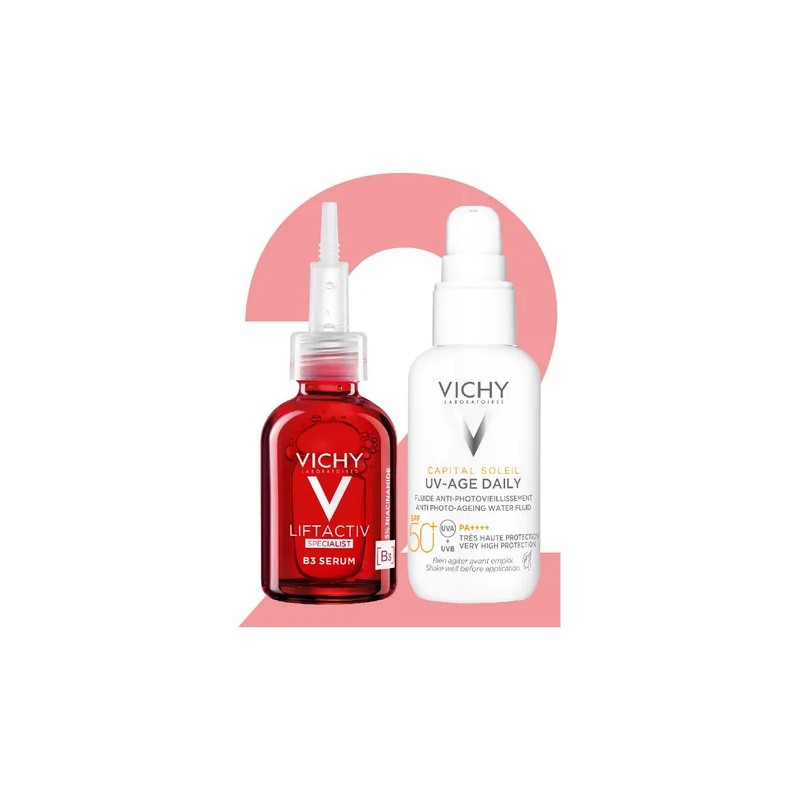 Este set combina el potente Sérum B3 antimanchas con el protector solar Capital Soleil FPS 50, para una rutina eficaz contra el envejecimiento y la pigmentación.