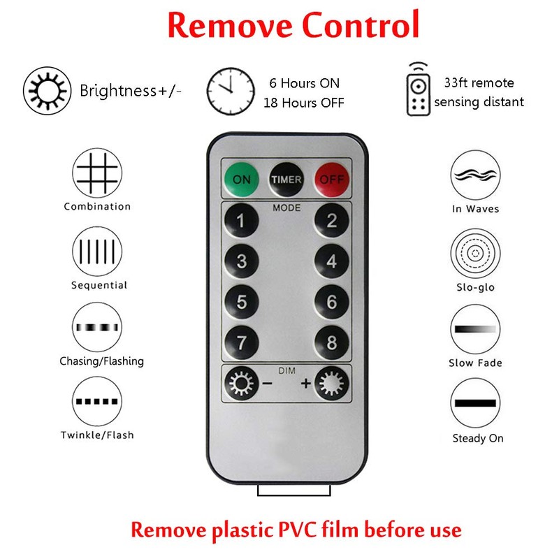 - Control remoto y 8 modos: dentro de 25 a 95 pies, encendido/apagado, 8 modos, temporizador y efectos de iluminación regulables, todos controlados por una placa de control remoto. (Combinación, en ondas, secuencial, SLO GLO, cambio/intermitente, desvanecimiento lento, centelleo/flash y encendido constante). También puedes controlar el modo de iluminación con el botón del USB.