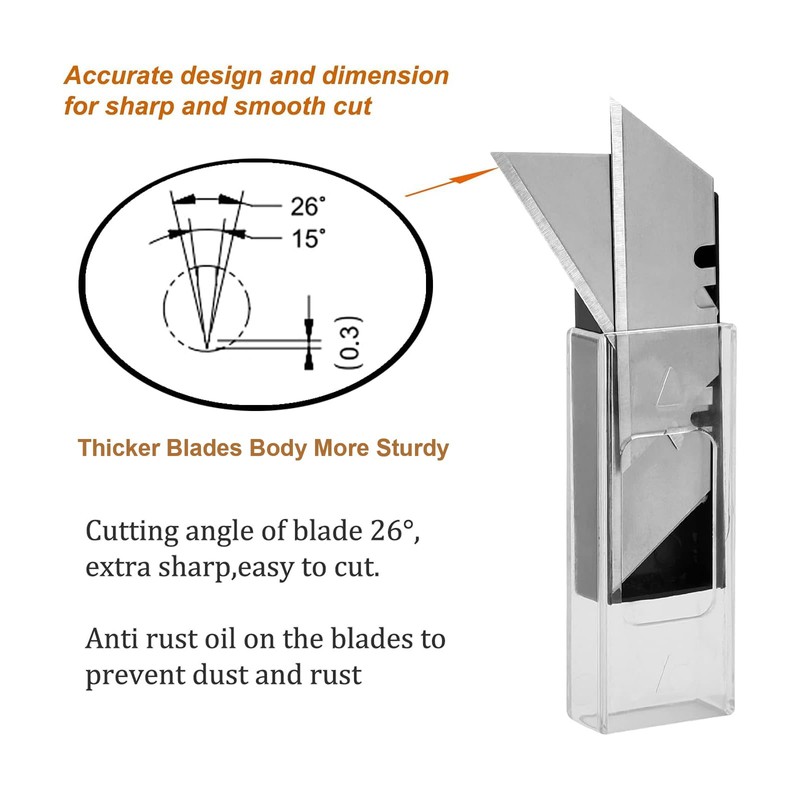 • Each utility knife blade was engineered with a precision-honed edge and 26cutting angle which make the blade sharp enough to cut.There is a layer of anti rust oil on the blades to prevent dust and rust.