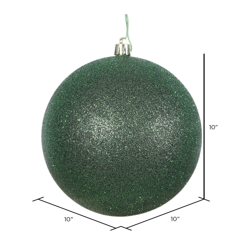 10Emerald glitter ball ornament. Shatterproof and UV resistant. Pre-drilled cap secured with 6of green floral wire. Comes with a 1 year seasonal warranty.. Vickerman company is an importer and wholesaler of quality seasonal decorations including traditional and realistic artificial Christmas trees, wreaths and garlands. In addition the company offers other realistic looking holiday foliage, Giant Christmas trees and a full line of unique display trees.