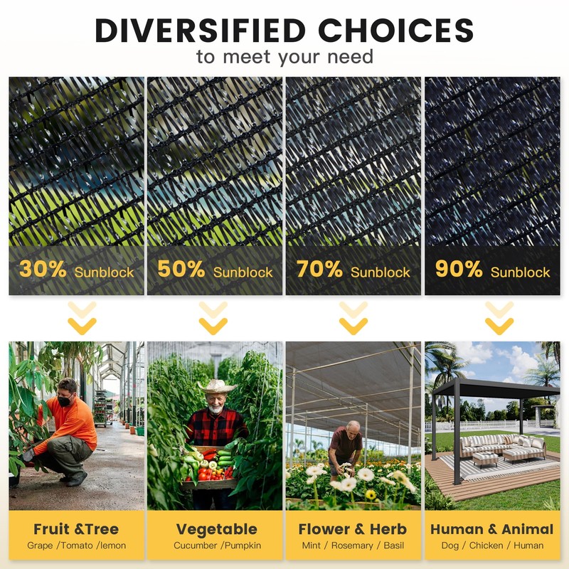 - Efficient Sun Protection: Our Shade Cloth, featuring a 30% shade rate, offers superior sun protection while maintaining air circulation. It efficiently blocks detrimental UV rays, safeguarding plants from damage and ensuring your outdoor areas remain cool and shaded.