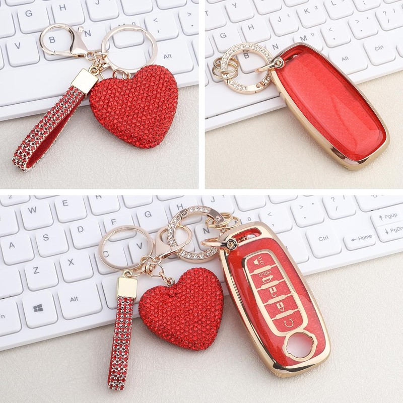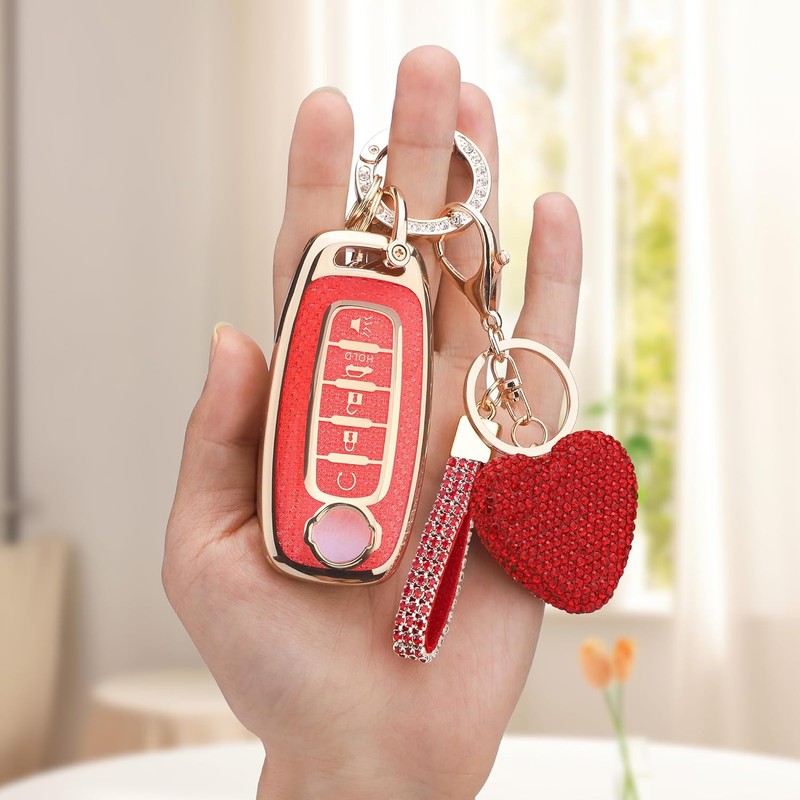 Vicoca for Nissan 5 Buttons Key fob Cover with Diamond Heart Keychain, Car Accessories TPU for 2023 2024 Pathfinder Rogue Remote Key, Gold Red