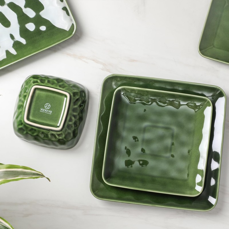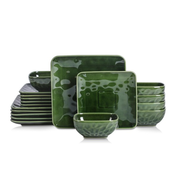 Vicrays Ceramic 18 Pieces Square Dinnerware Set - Dinner Plates Salad Plates Cereal Bowls Set Service for 6 - Scratch Resistant Microwave Oven Dishwasher Safe - Green